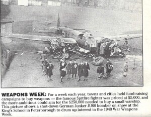 The JU88 was a Luftwaffe multi-role aircraft, commonly used as a bomber, that had been shot down somewhere over the UK, and was put on display at various locations around the country. The aim was to encourage the population to do the patriotic thing and contribute to the National War Savings drive, by purchasing Government Savings Bonds and Certificates, as part of War Weapons Week. Members of the public, including King’s School pupils, could climb into the plane for a closer look, once they had made their 15 shilling purchase!