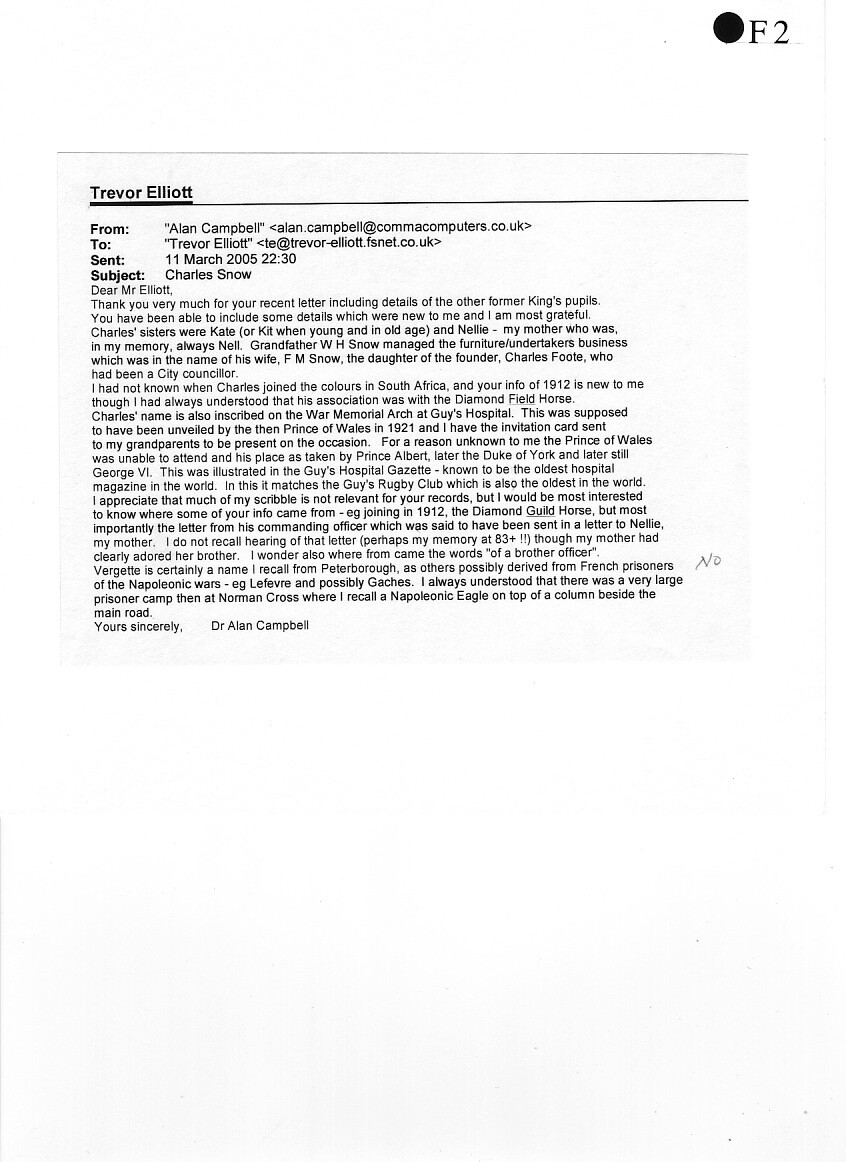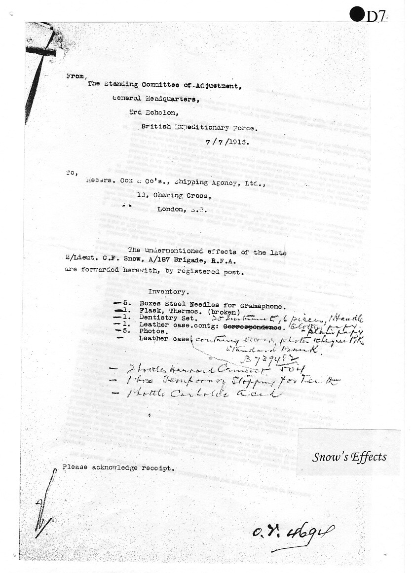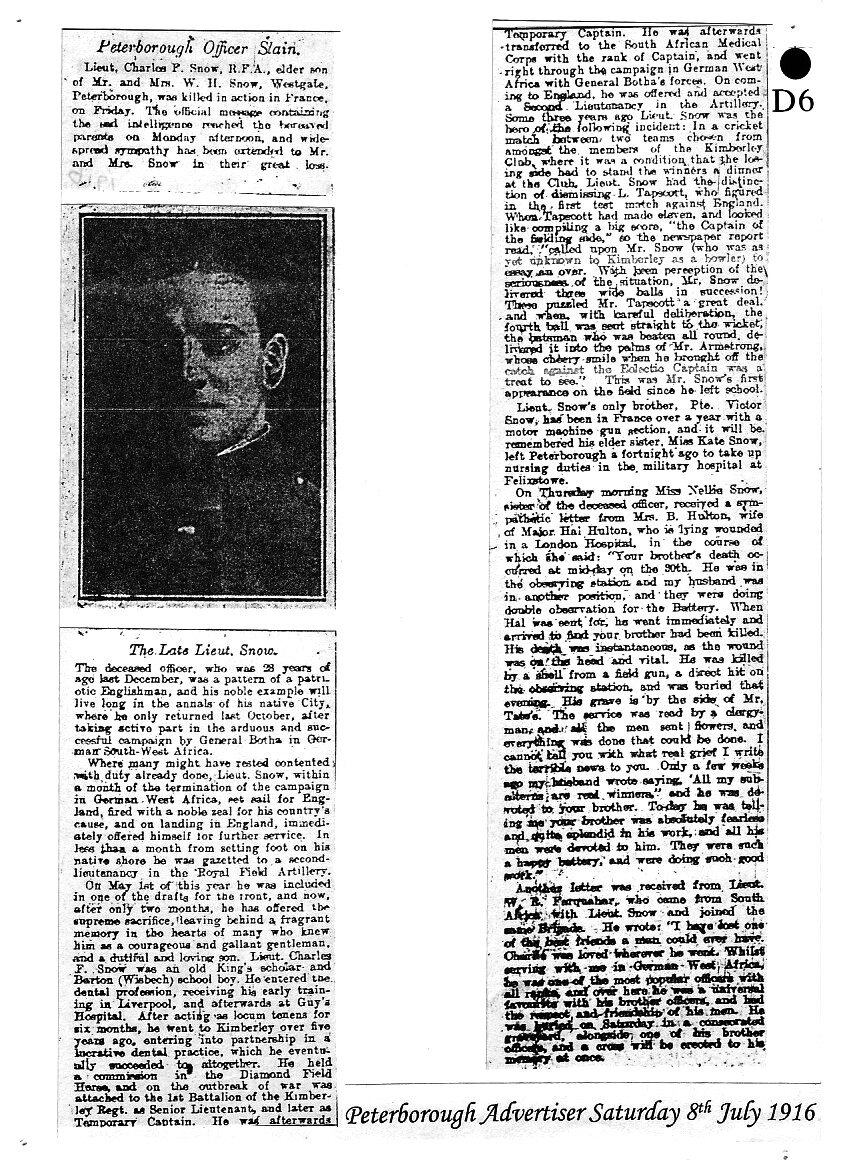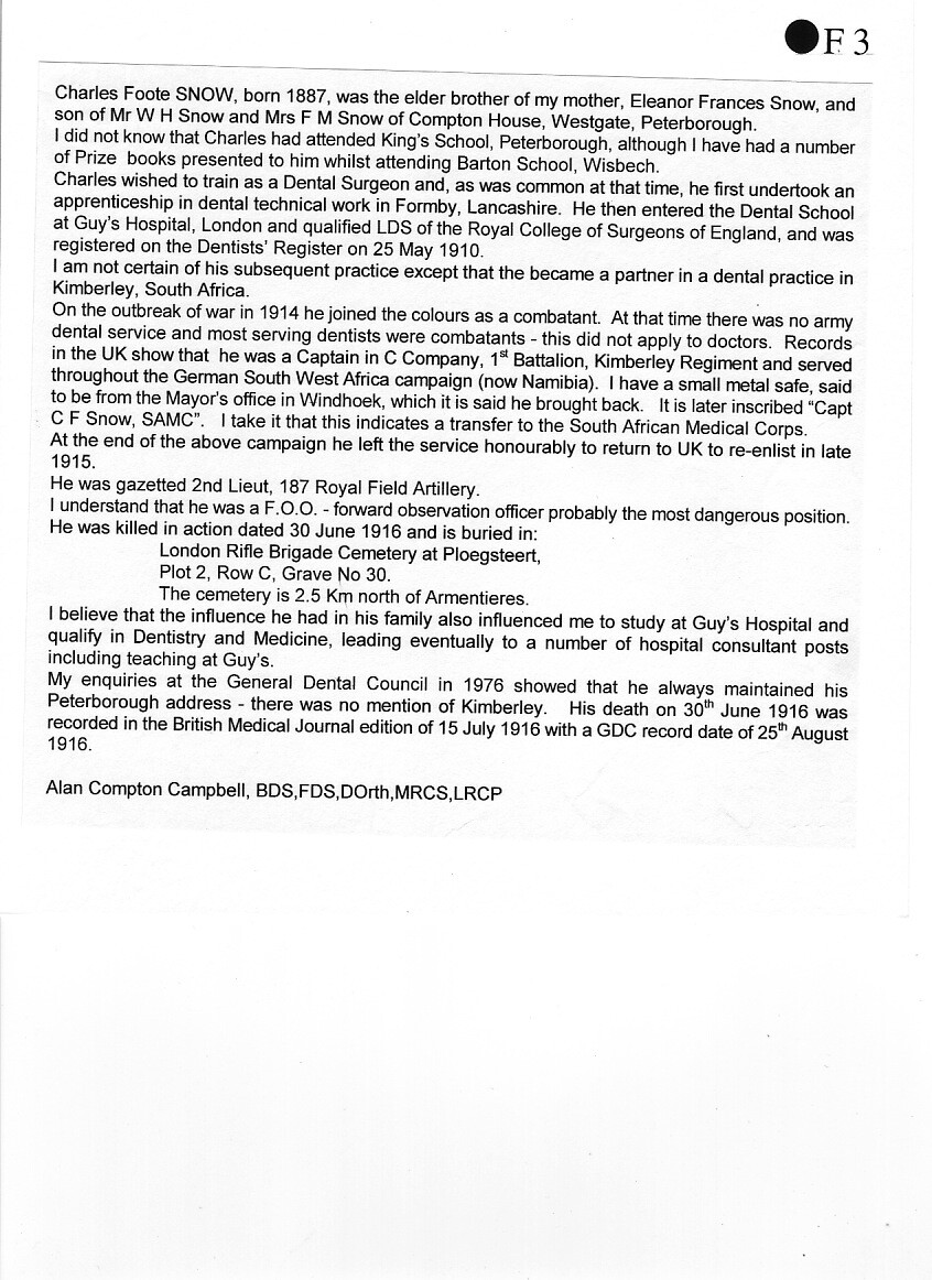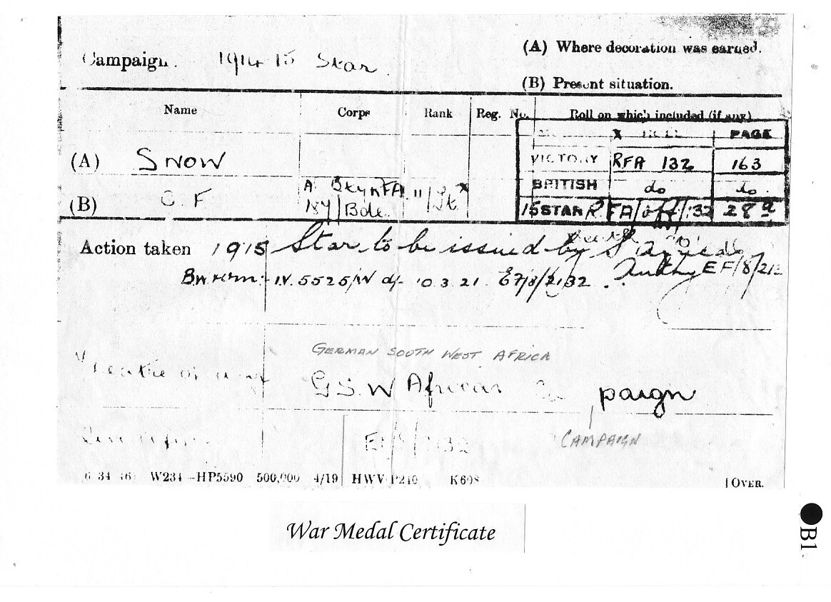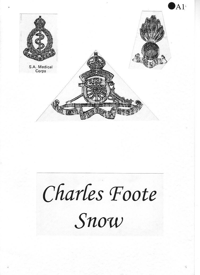 In 1912, Charles joined the Diamond Field Light Horse, a South African cavalry regiment, as a Lieutenant. At the outbreak of war in 1914, he joined the 1st Battalion Kimberley Regiment as a Senior Lieutenant, later transferring to the South African Medical Corps as a Captain. Like Percy Flecknoe, he served under General Botha's command in the German West Africa Campaign. On its completion, Snow sailed for England to be offered, and accept, a commission in the Royal Field Artillery.