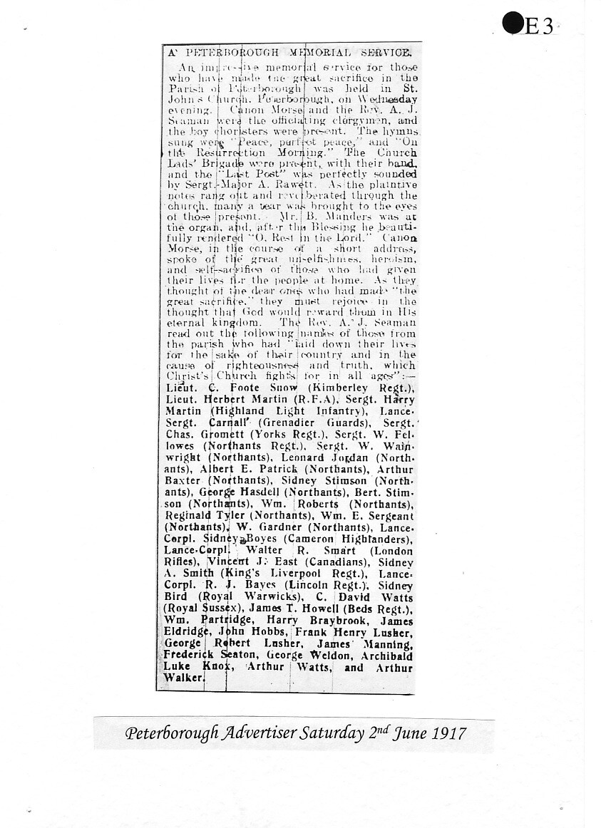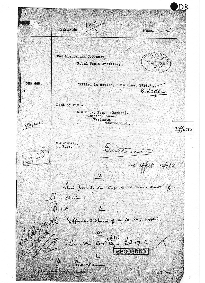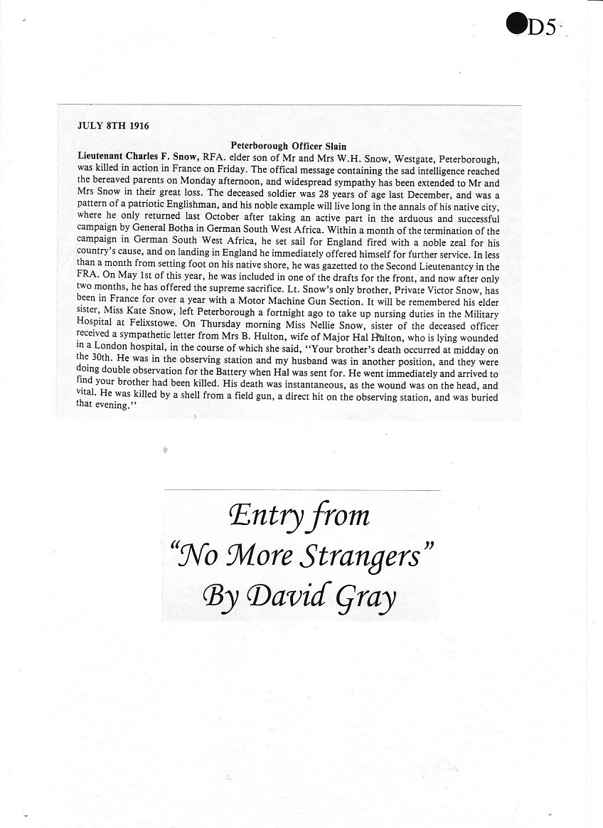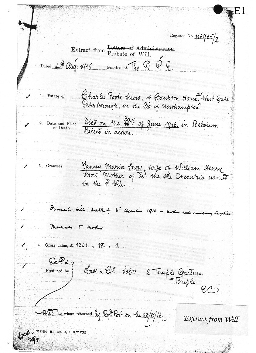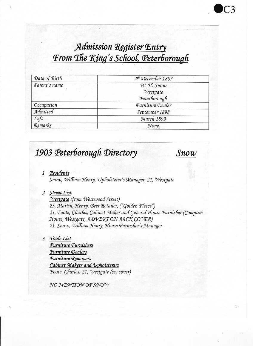 Charles was born on 4 December 1887 to William Henry Snow and his wife Fanny Maria, of Compton House, 21 Westgate, Peterborough, where William was a furniture dealer. Charles had a brother Victor and two sisters, Kate and Nellie.