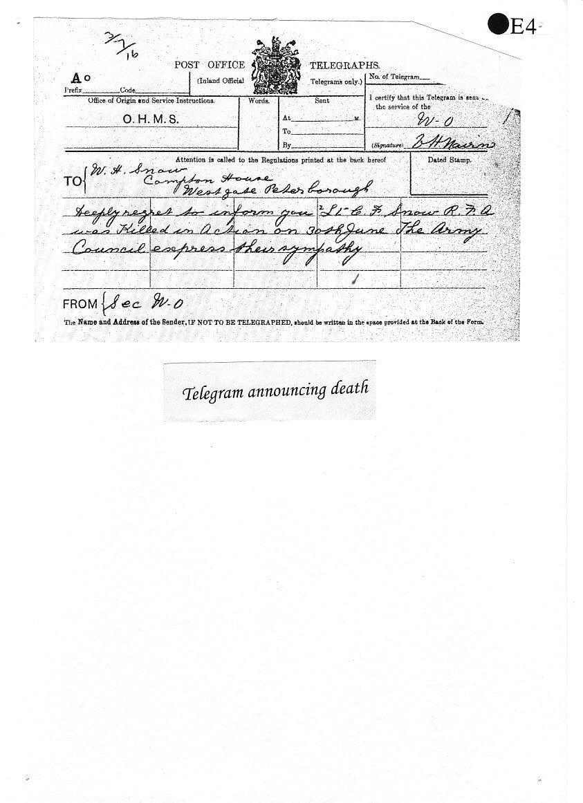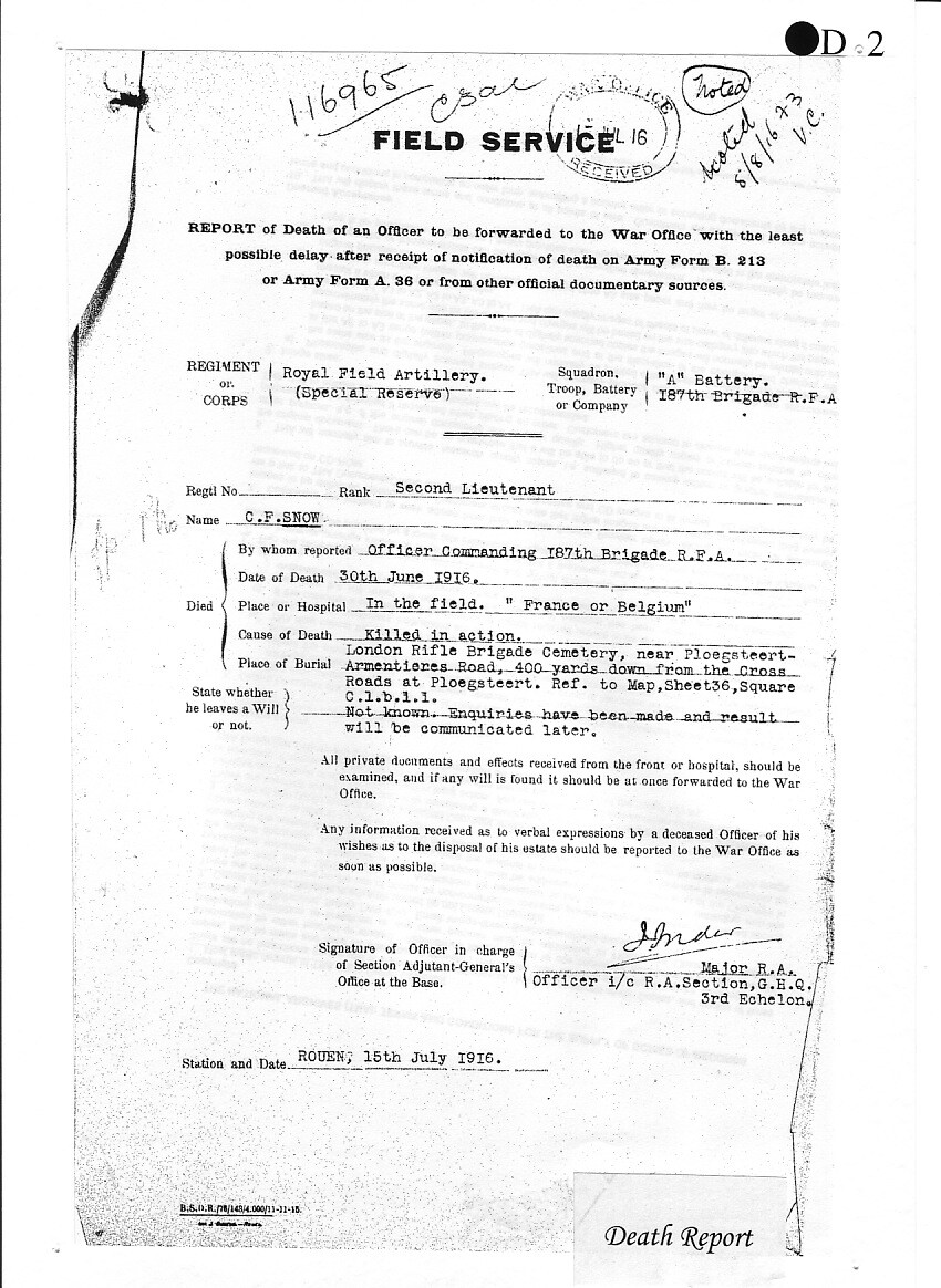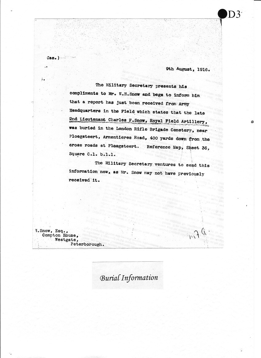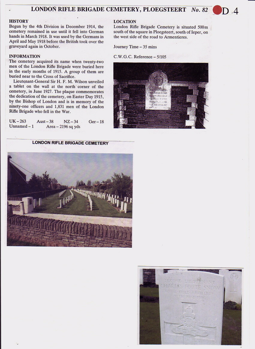 Charles Snow is buried at the London Rifle Brigade Cemetery, Ploegsteert, Belgium.