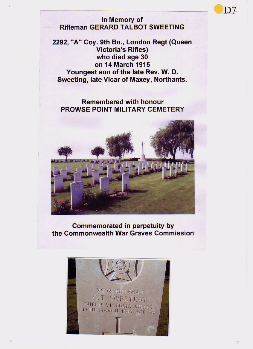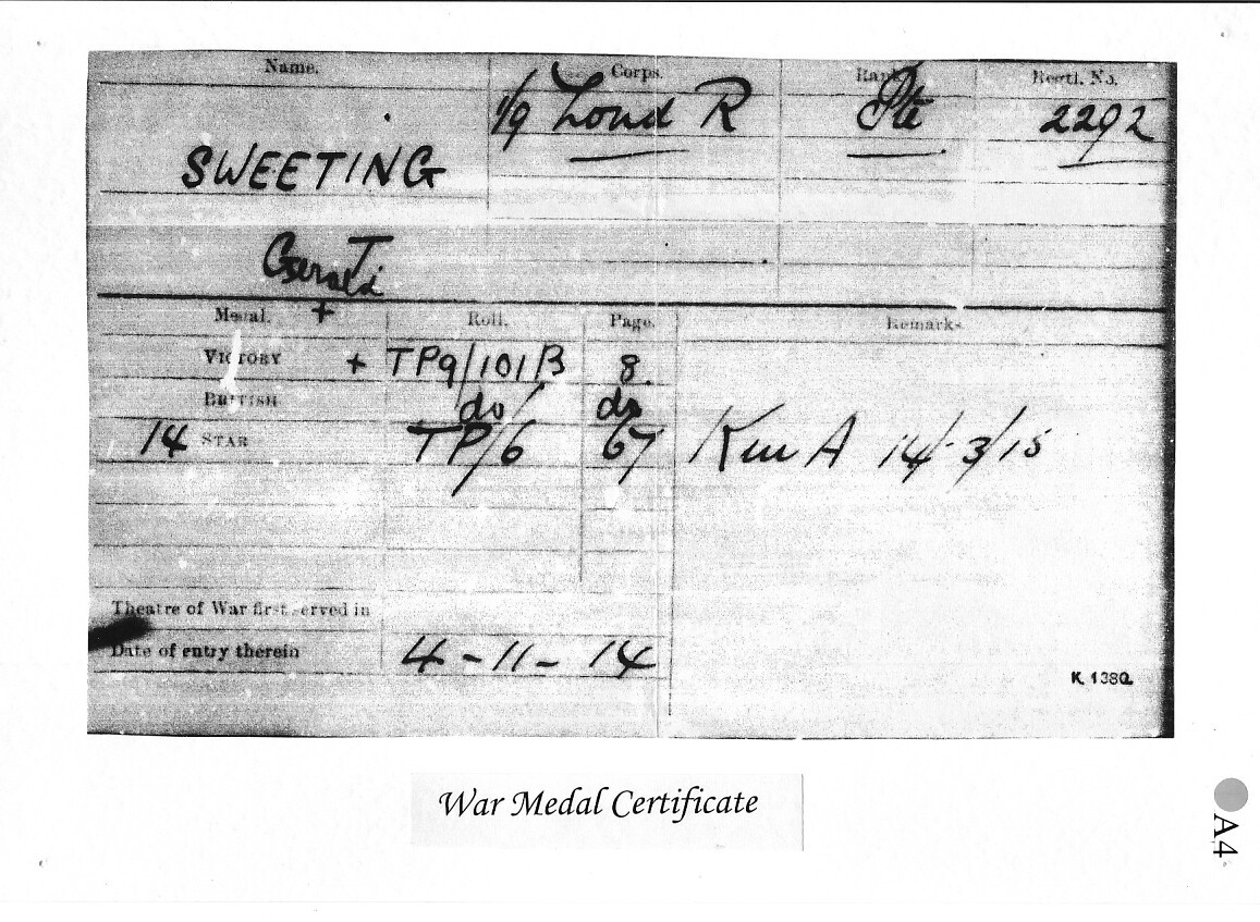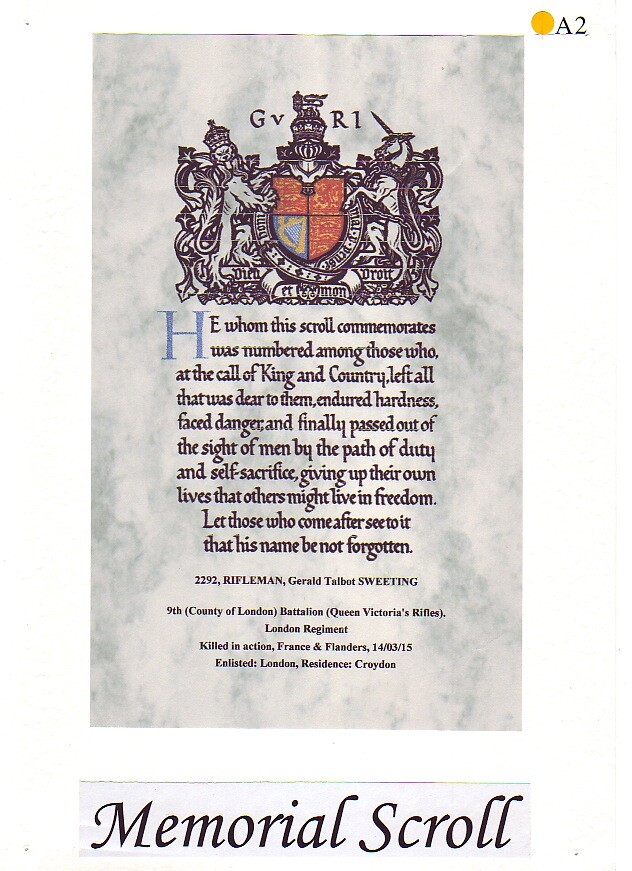 In about 1912 Gerald joined the Queen Victoria’s Rifles as a territorial soldier. Not only did this teach him soldiering but it would also have been treated as something of a social Gentlemen’s Club. On 4 November 1914 Gerald was called to the Colours to join ‘A’ Coy 9th Battalion London Regiment and sailed for France the same day.