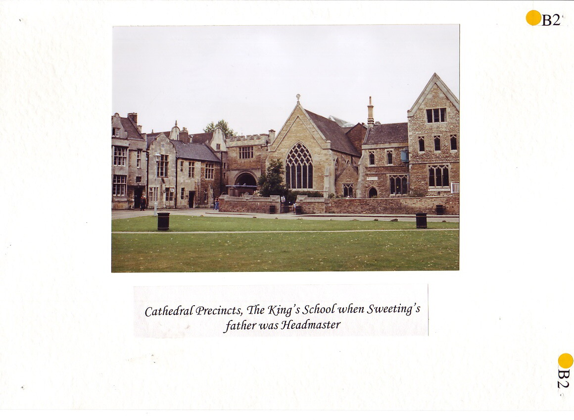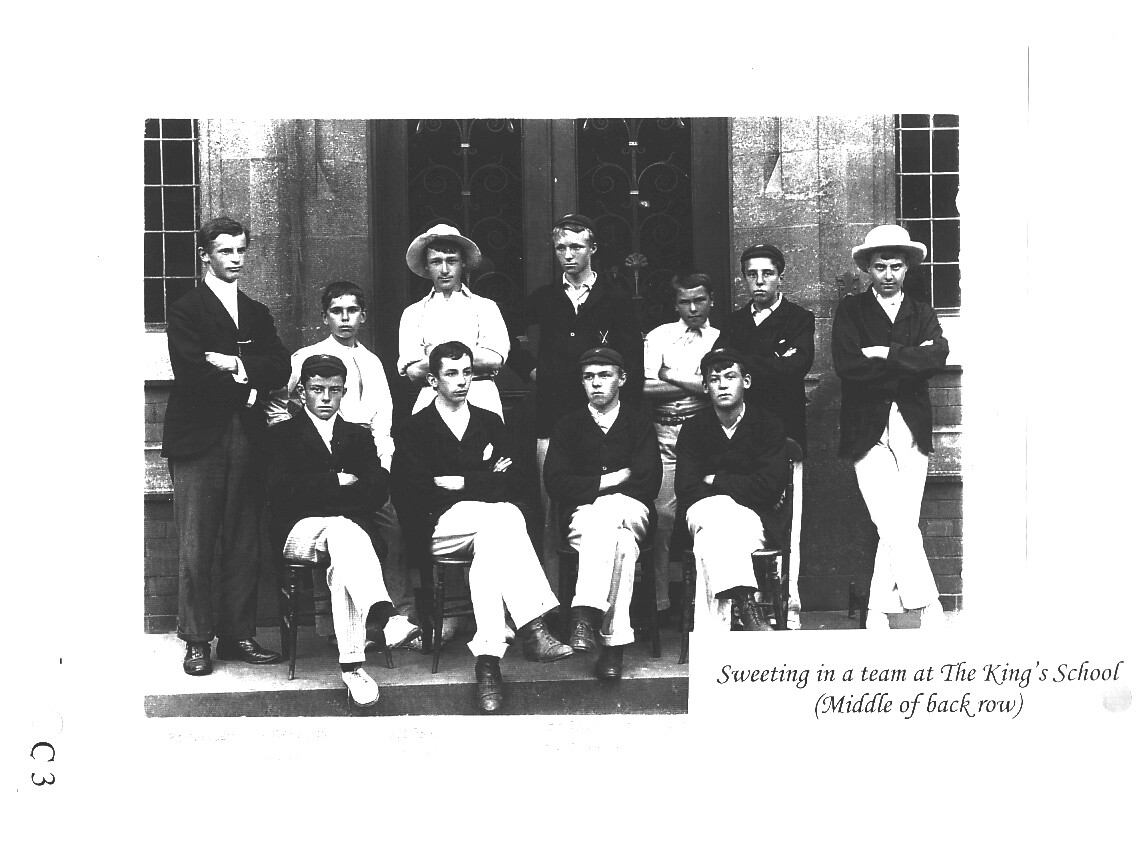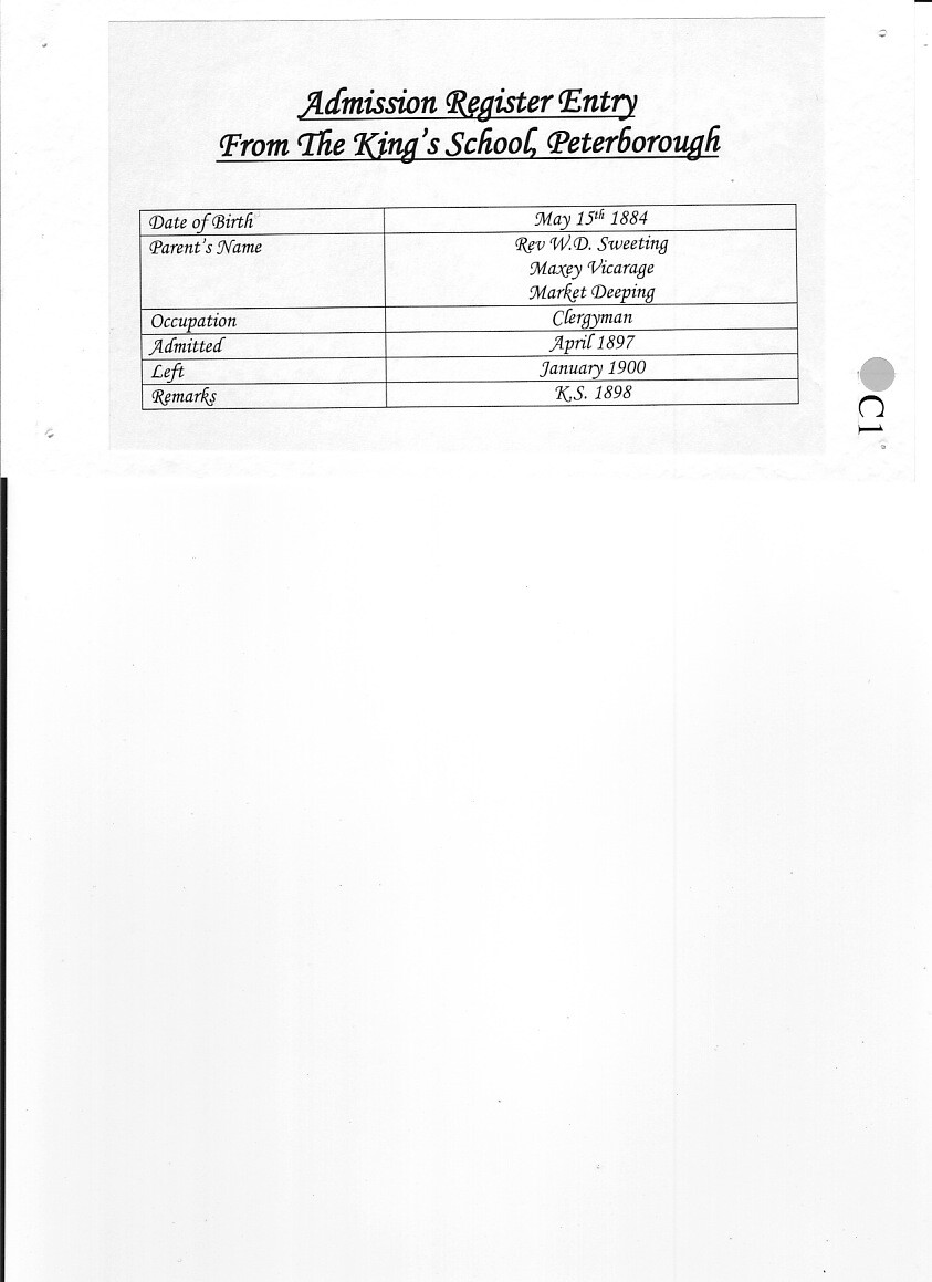 Gerald Talbot Sweeting was born on 15 May 1884 to the Rev. Walter Debenham Sweeting and his wife Maria Georgina. He was the youngest of seven children, five sons and two daughters. His father had been Second Master (the equivalent of today's Deputy Head) and later Headmaster of The King's School, a position he held for 20 years. On leaving King's Mr Sweeting had become vicar of Maxey.