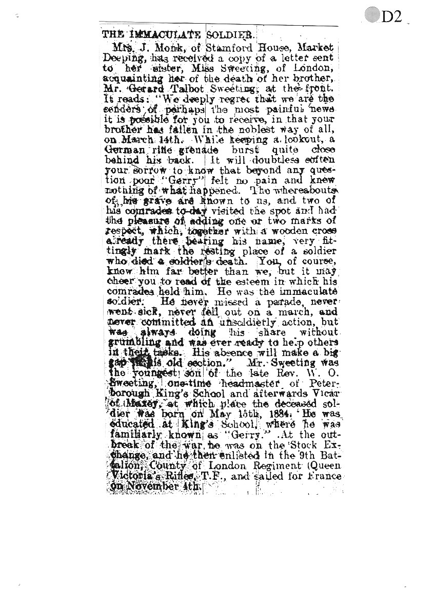 His mother died on 1 November 1900 and Reverend Sweeting moved to London, possibly to be near his family or his son. By 1906 Gerald was working in a Stockbroker's Office in the City of London, with a home address of ‘Maxey’, Queens Road, Wallington, Surrey.