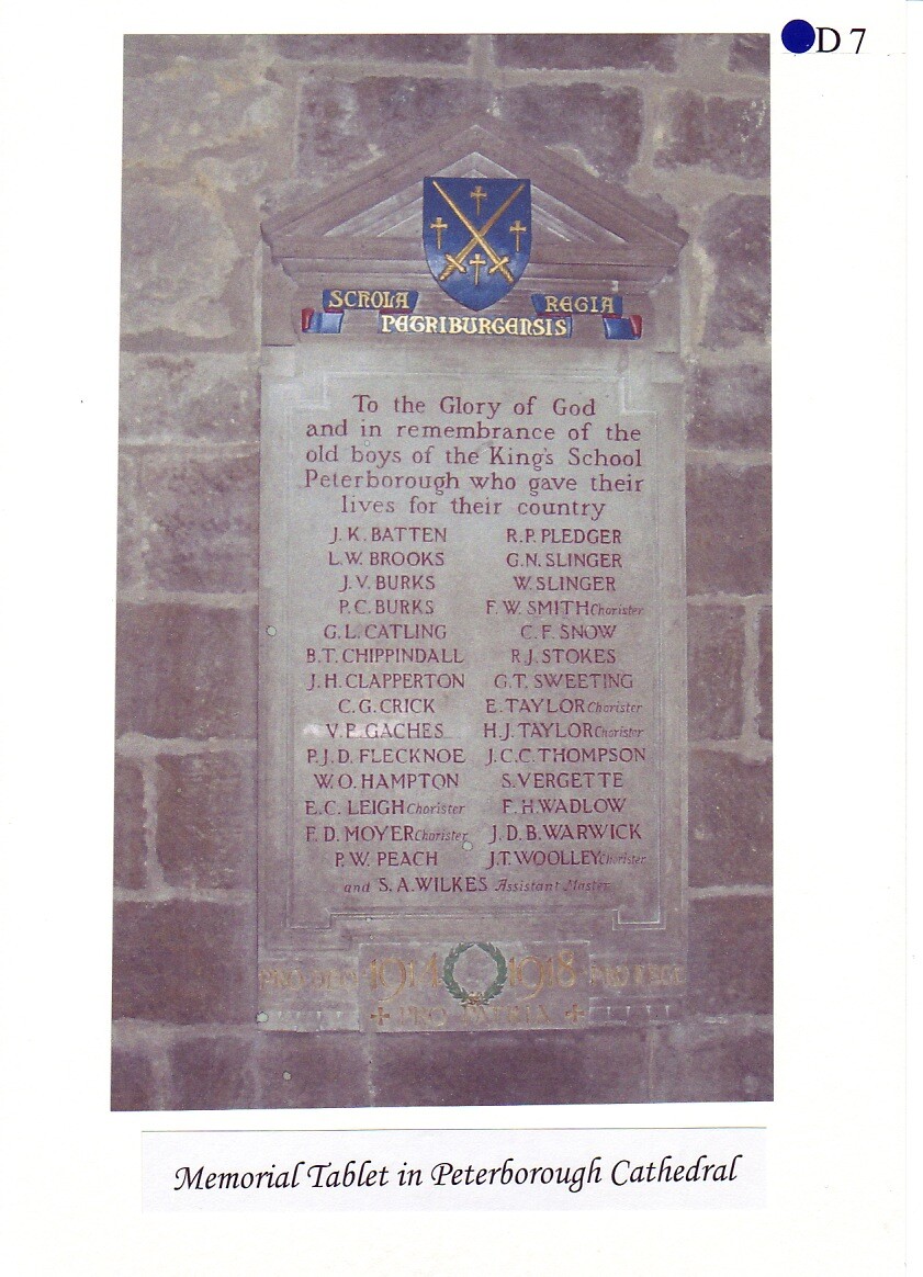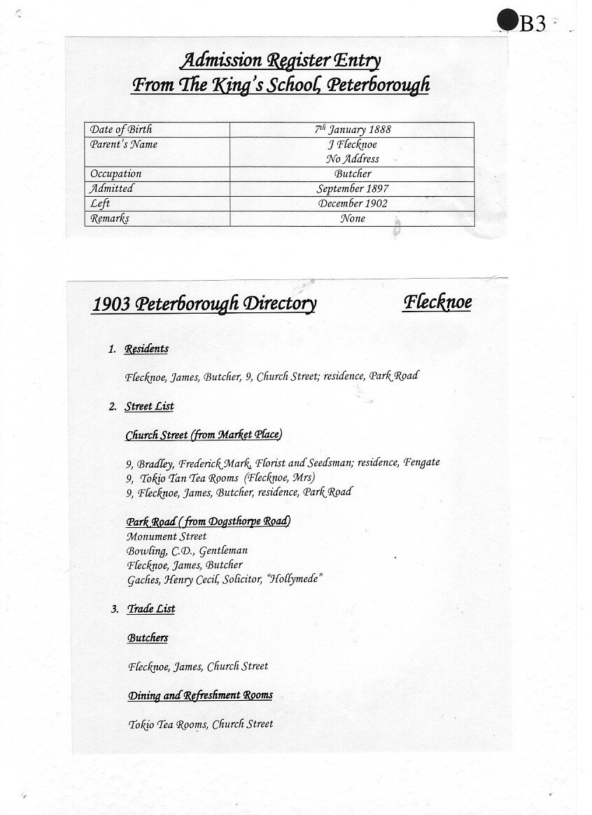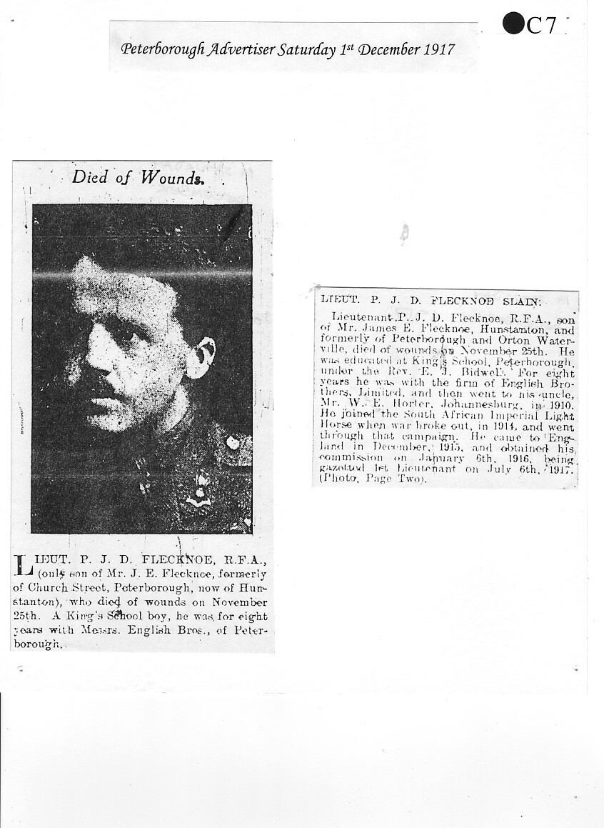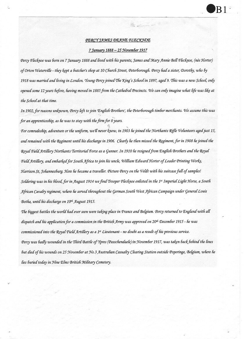 Percy Flecknoe was born on 7 January 1888 and lived with his parents, James and Mary Annie Bell Flecknoe, (née Horter) of Orton Waterville. They kept a butcher's shop at 10 Church Street, Peterborough. Percy had a sister, Dorothy, who by 1918 was married and living in London. Young Percy joined The King’s School in 1897, aged 9. This was a new School, only opened some 12 years before, having moved in 1885 from the Cathedral Precincts. We can only imagine what life was like at the School at that time.