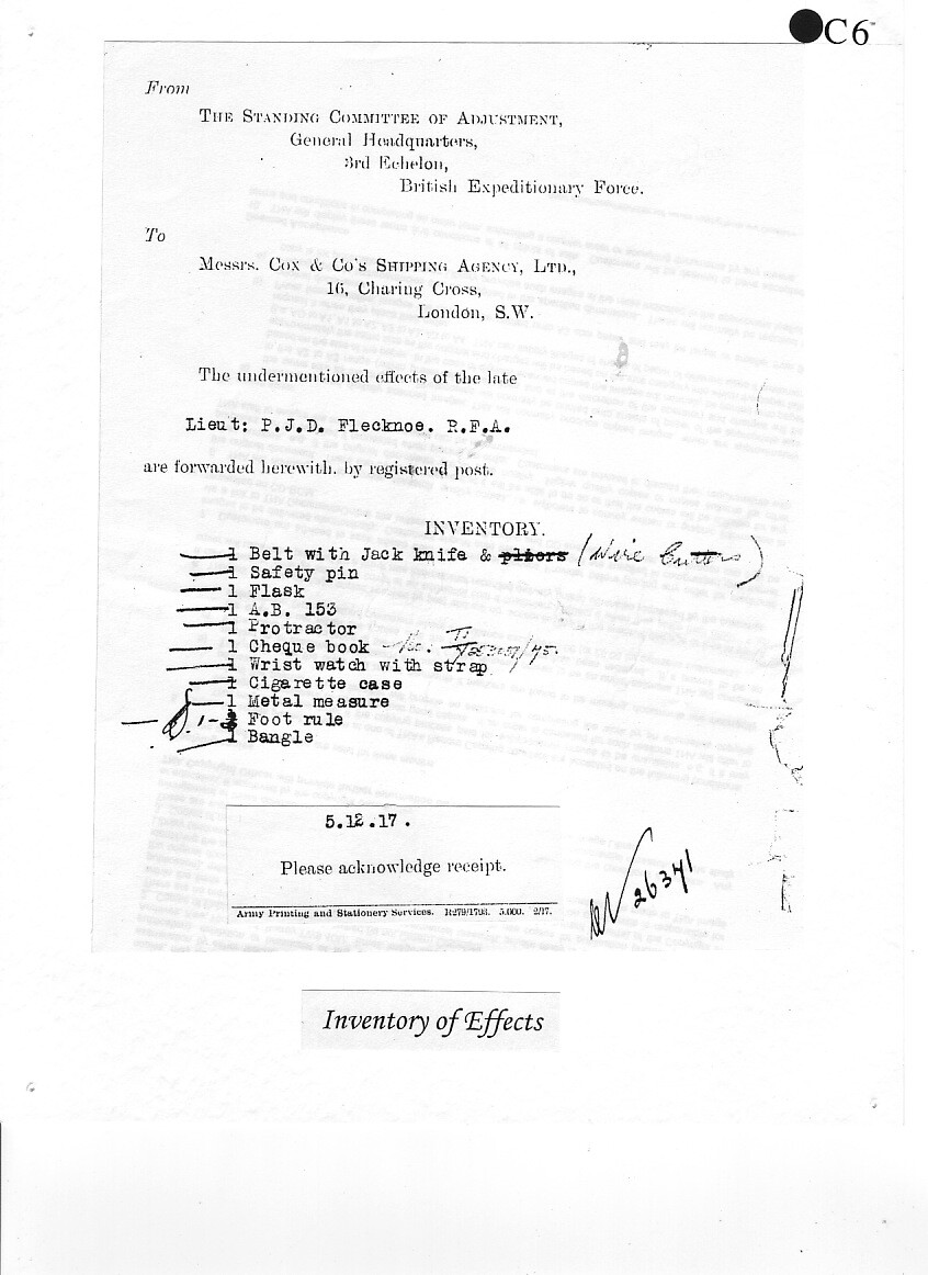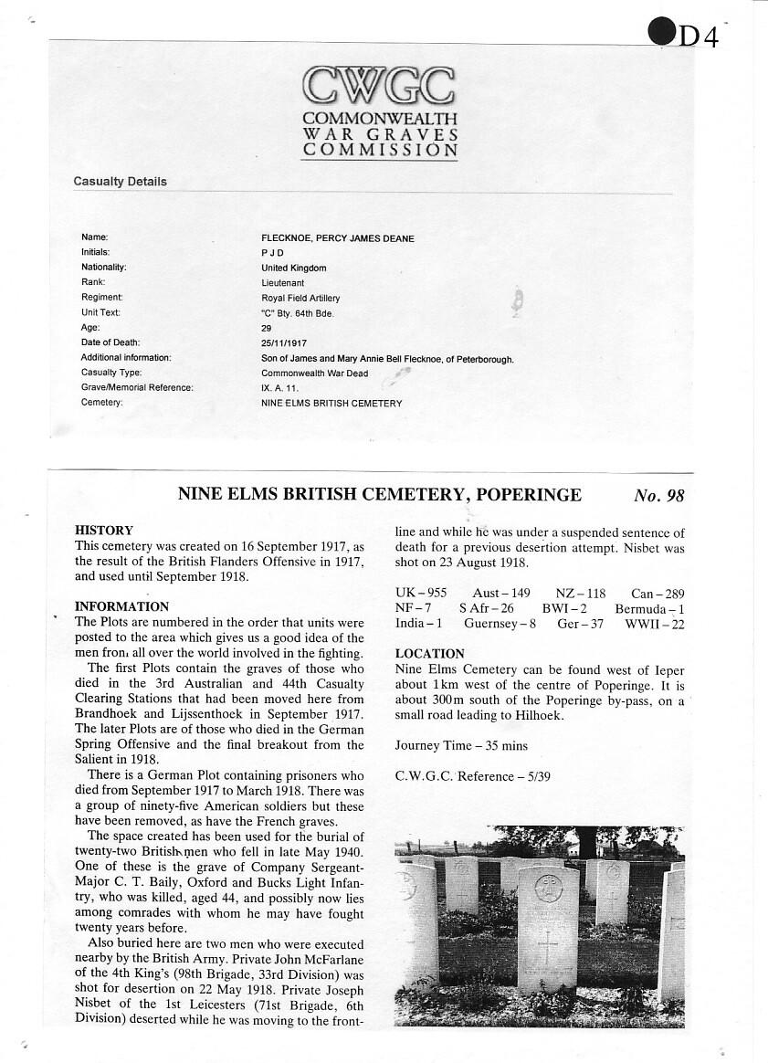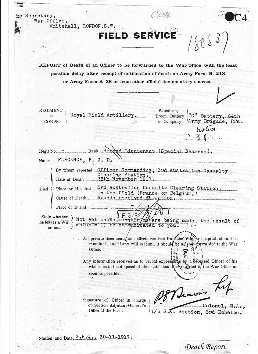 Percy was badly wounded in the Third Battle of Ypres (Passchendaele) in November 1917, was taken back behind the lines but died of his wounds on 25 November at No.3 Australian Casualty Clearing Station outside Poperinge, Belgium, where he lies buried today in Nine Elms British Military Cemetery.