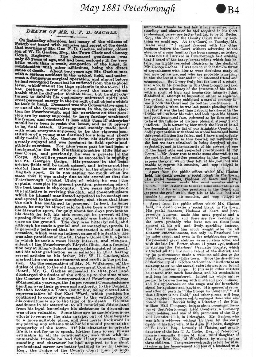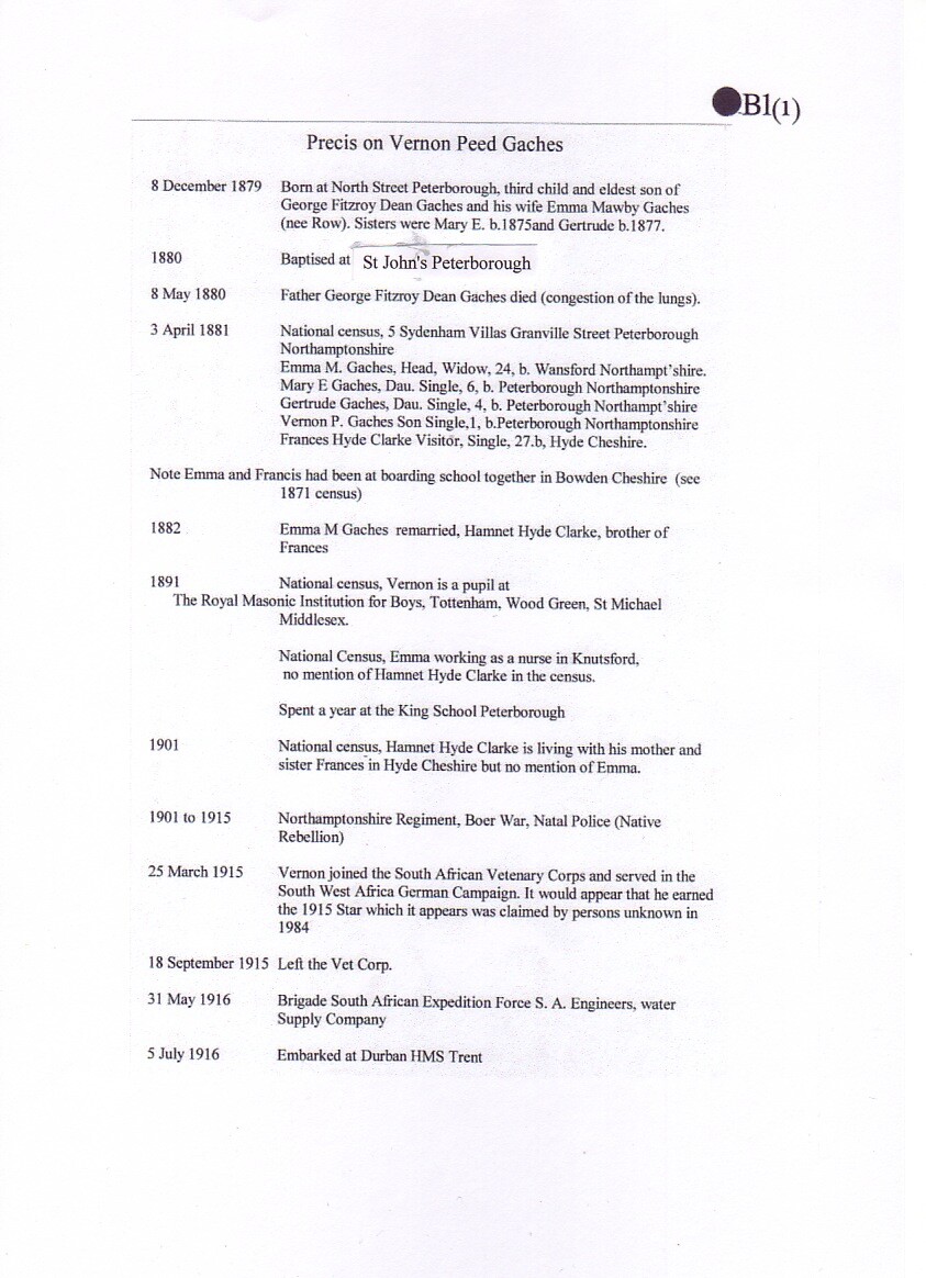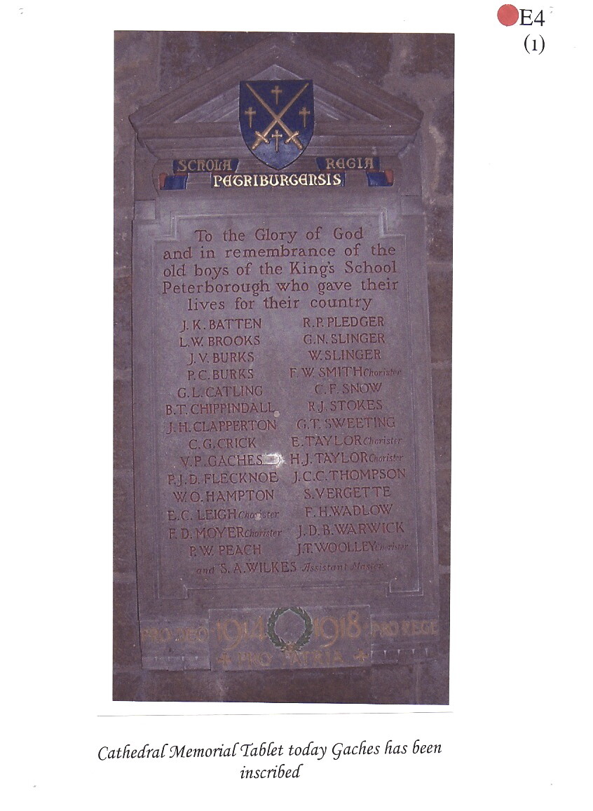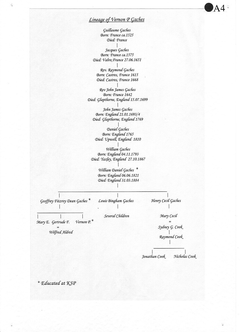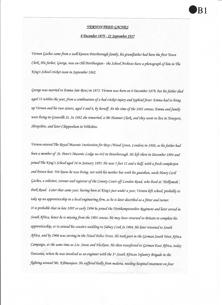 Vernon Gaches came from a well-known Peterborough family, his grandfather had been the first Town Clerk. His father, George, was an Old Petriburgian - the School Archives have a photograph of him in The King's School rugby team in September 1862.