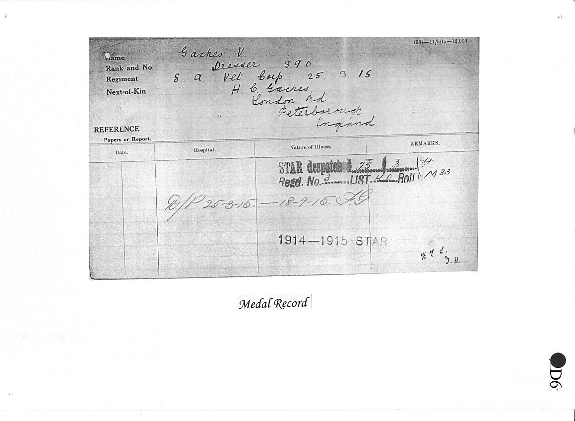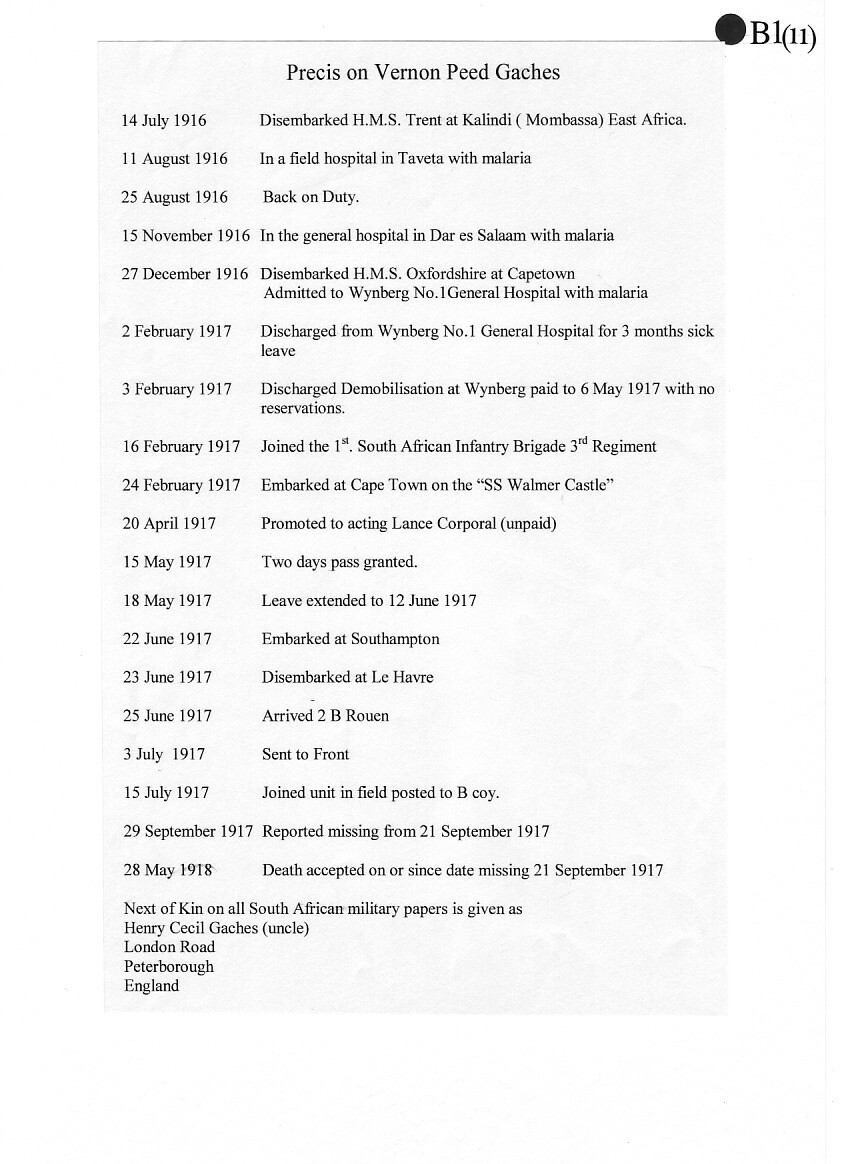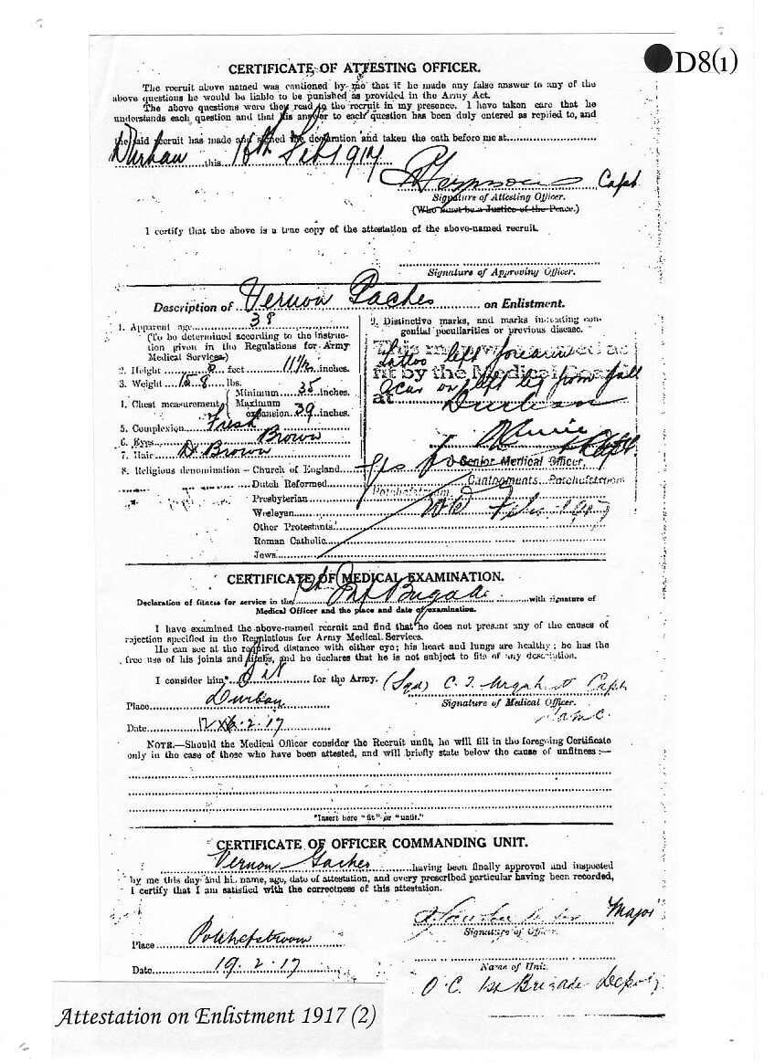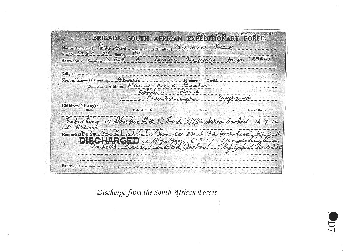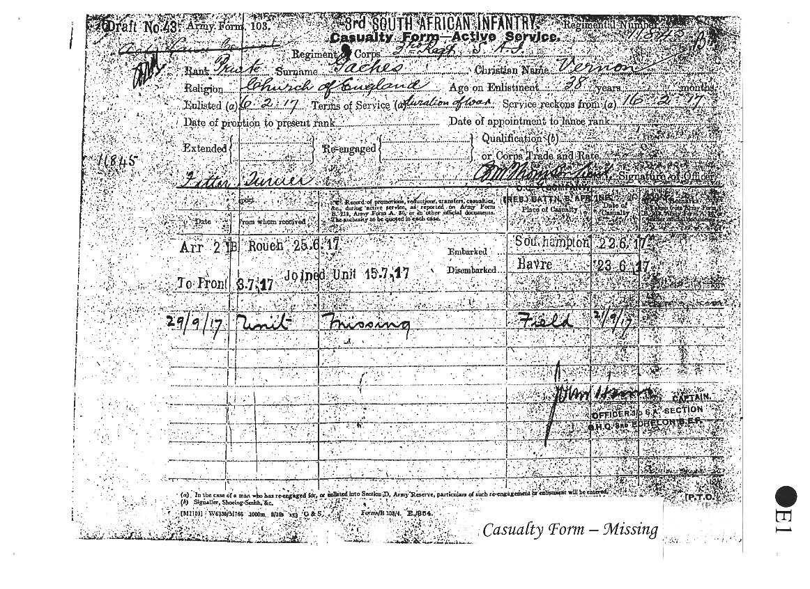 Vernon was soon fit again, rejoined the forces, this time the 3rd Regiment South African Infantry, and set sail for England on board the MS Walmer Castle. He crossed to France on 22 June from Southampton to Le Havre, and went on to serve both in the Water Supply Battalion, and as a Dresser in the South African Veterinary Corps. Vernon saw just 3 months' service, before going missing on 21 September 1917. He was then presumed killed in action somewhere in the Ypres Salient, aged 37. His body was never found, and so he is commemorated on the Menin Gate Memorial to the Missing in Ypres.