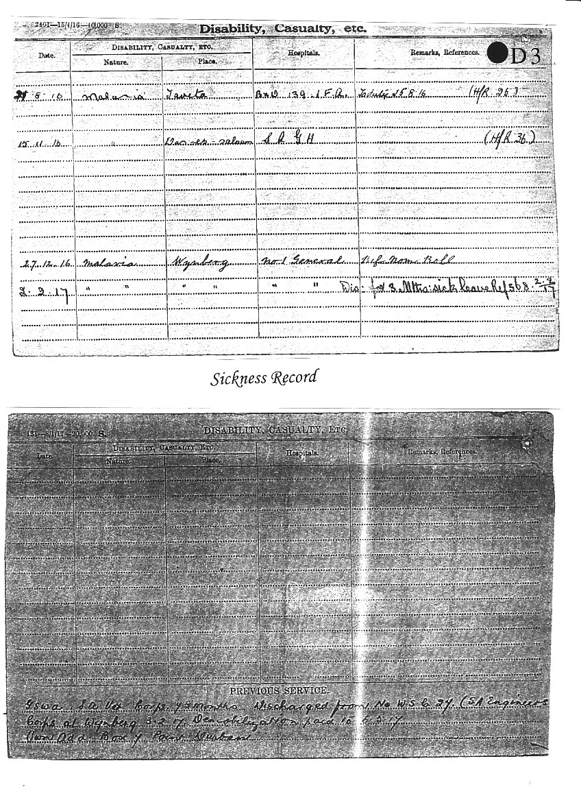 It is probable that in late 1895 or early 1896 he joined the Northamptonshire Regiment and later served in South Africa, hence he is missing from the 1901 census. He may have returned to Britain to complete his apprenticeship, or to attend his cousin's wedding to Sidney Cook in 1904. He later returned to South Africa, and by 1906 was serving in the Natal Police Force. He took part in the German South West Africa Campaign, at the same time as Lts. Snow and Flecknoe. He then transferred to German East Africa, today Tanzania, where he was involved as an engineer with the 1st South African Infantry Brigade in the fighting around Mount Kilimanjaro. He suffered badly from malaria, needing hospital treatment on four occasions between August 1916 and February 1917, when he was demobilised and shipped back to Cape Town to convalesce.